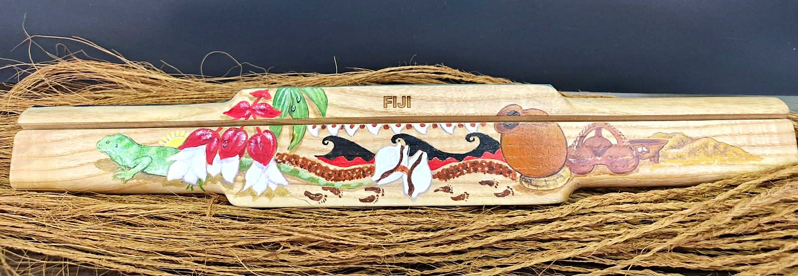 Endemic orchids and fragrant mokosoi flowers bloom across the design alongside Fiji's iconic barkcloth art, known as i-seru, bold geometric motifs form a ceremonial border at the baton's end. At the centre sits the tabua, a sacred whale's tooth—the ultimate symbol of honour and respect in Fijian culture. Its placement says everything about how Fiji regards this moment: with ceremony, with reverence and with the full weight of cultural tradition.