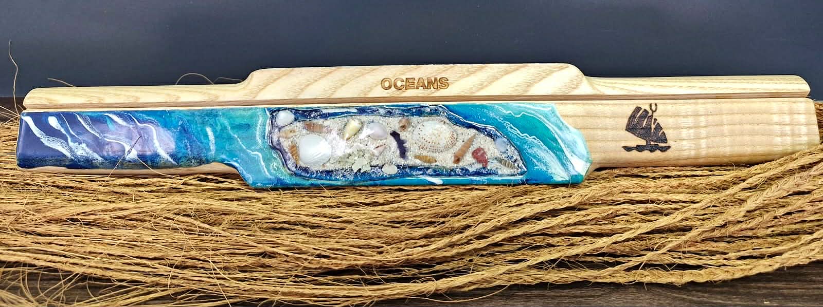 This side speaks to the Commonwealth's shared responsibility toward the seas. Flowing resin in deep blues reflects "the eternal rhythm of the sea," embedded with real shells gathered from Fijian beaches carrying "the mana of our shores." Sand from Rotuma, Fiji's most remote outer island, anchors the baton, reminding that no community stands alone.